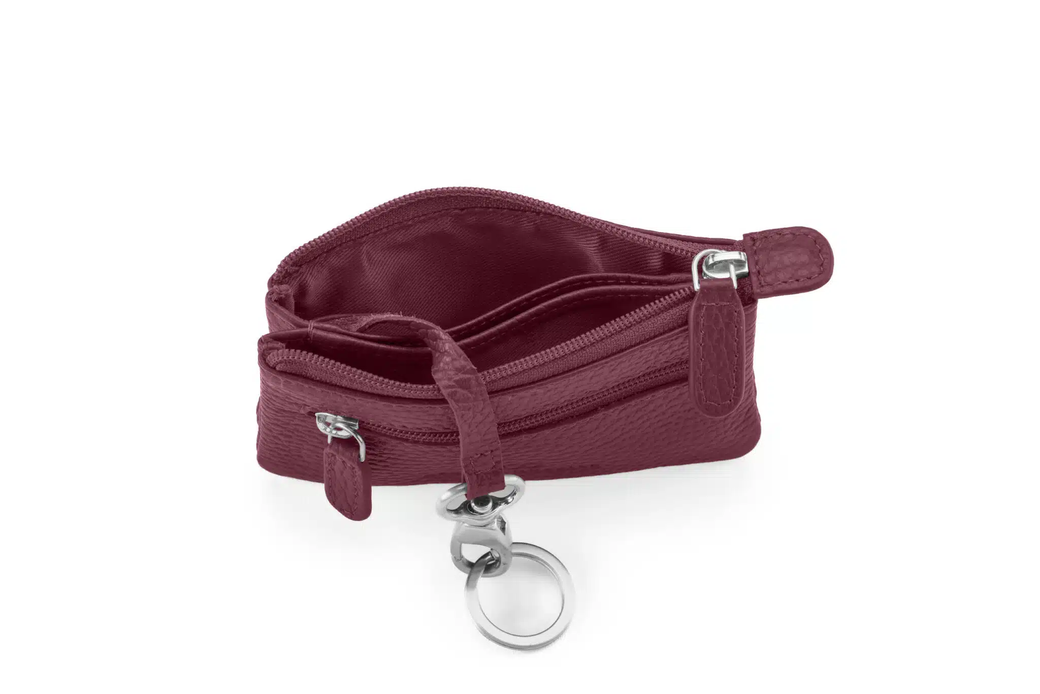 Ein Außenfach – ebenfalls mit Reißverschluss – und ein Karabiner mit Schlüsselring ergänzen die praktische Schlüsseltasche.