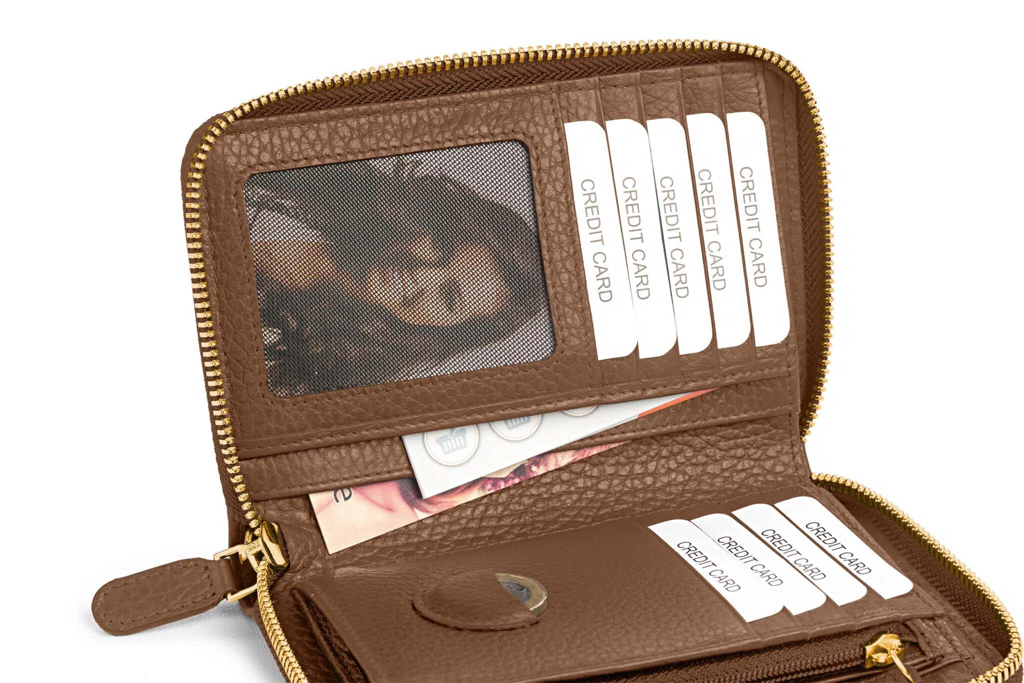 - neun Kartenfächer, eines mit Sichtfenster,