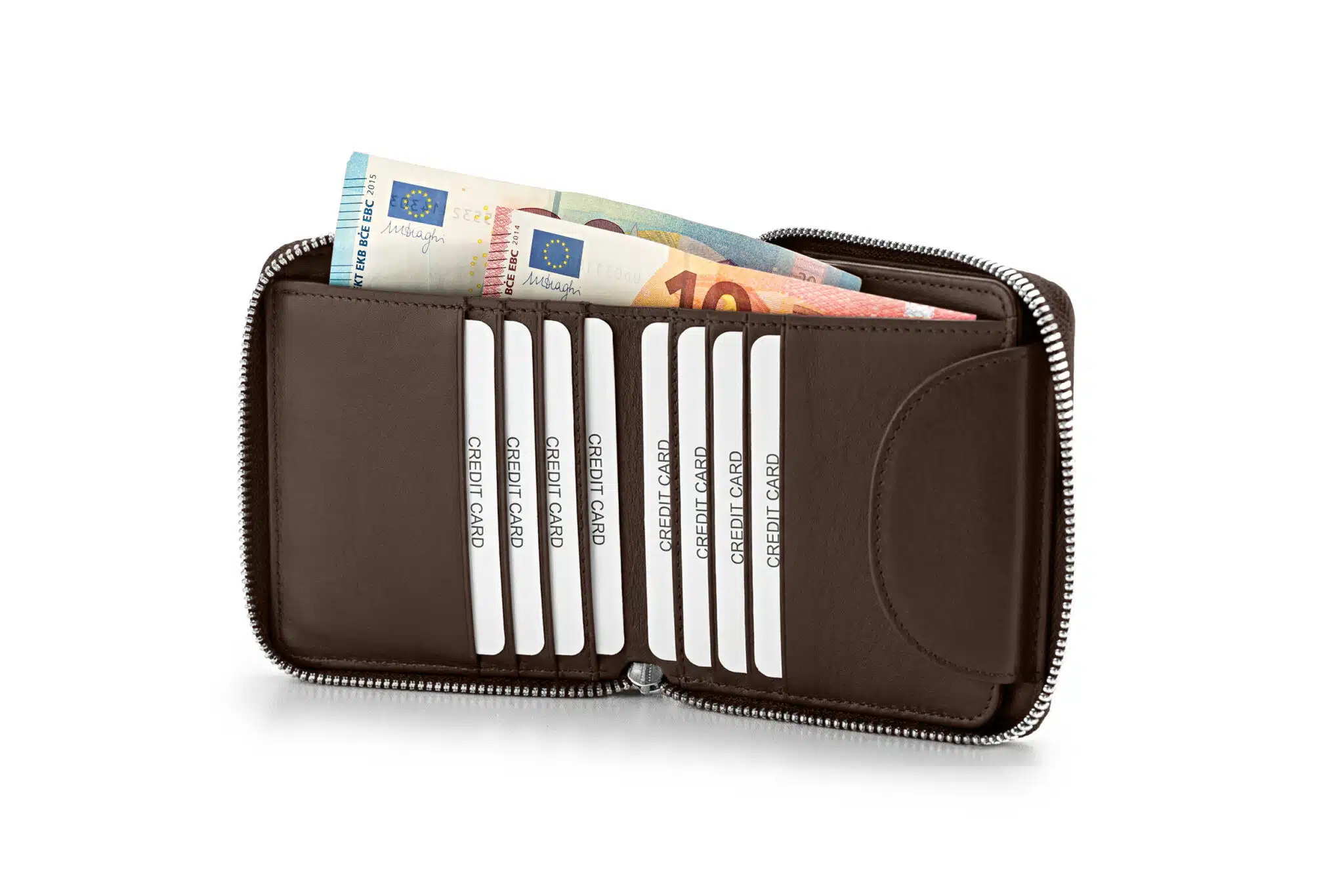 - acht Fächer für Bank-, Kredit und Kundenkarten,