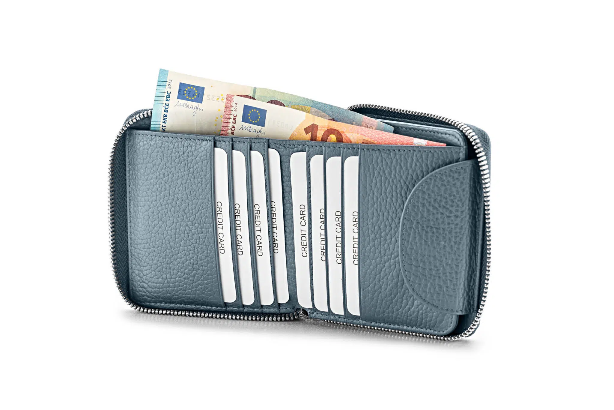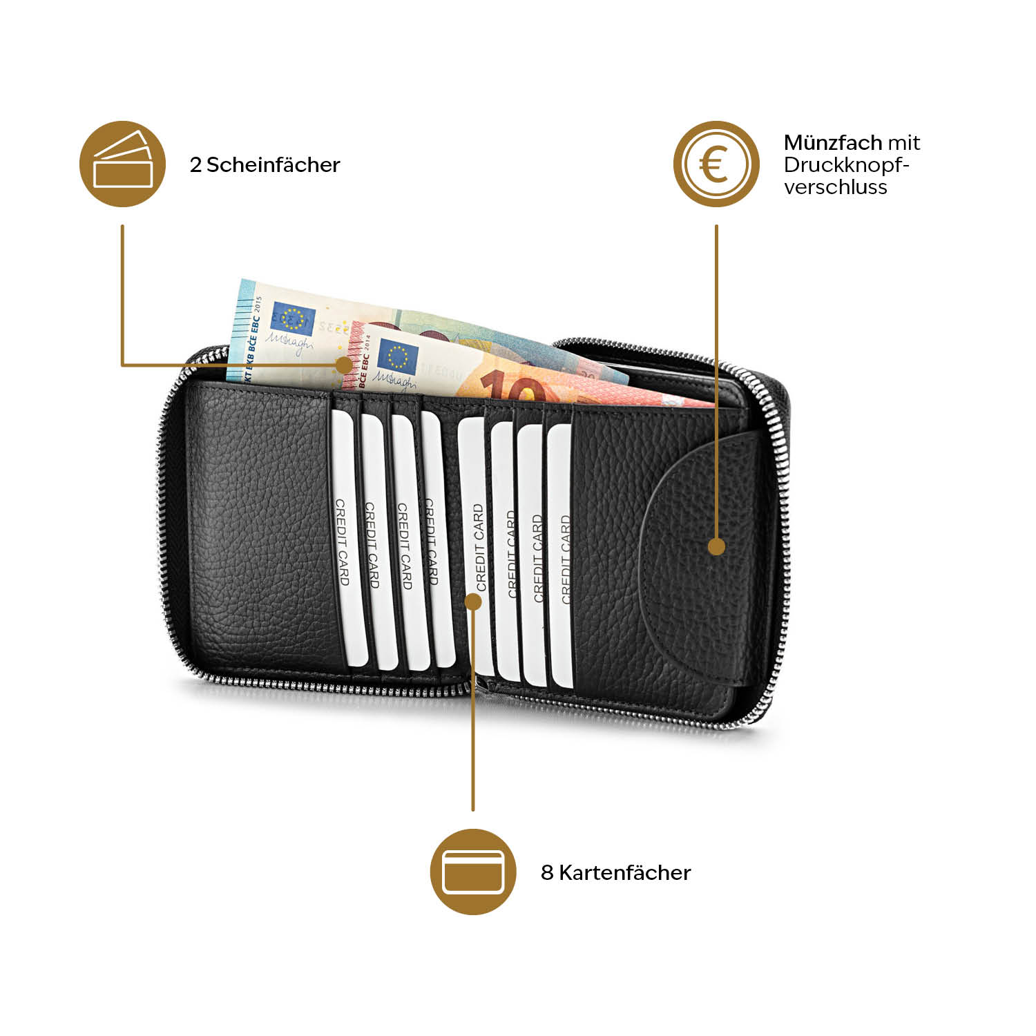 - acht Fächer für Bank-, Kredit und Kundenkarten,