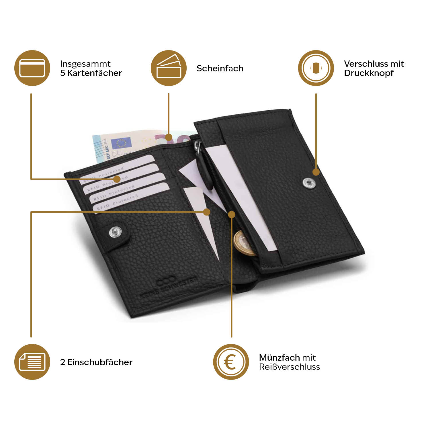 - ein Hauptfach für Scheine oder Belege,