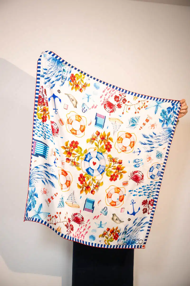 Nordische Motive in strahlenden, maritimen Farben aus reiner Seide machen das Tuch NORDISCH farbig 90×90 zu einem absoluten Hingucker. Klassisch um die Schulter getragen, trendy als Gürtel oder lässig um die Hüfte – trag es, wie es für dich am schönsten ist.