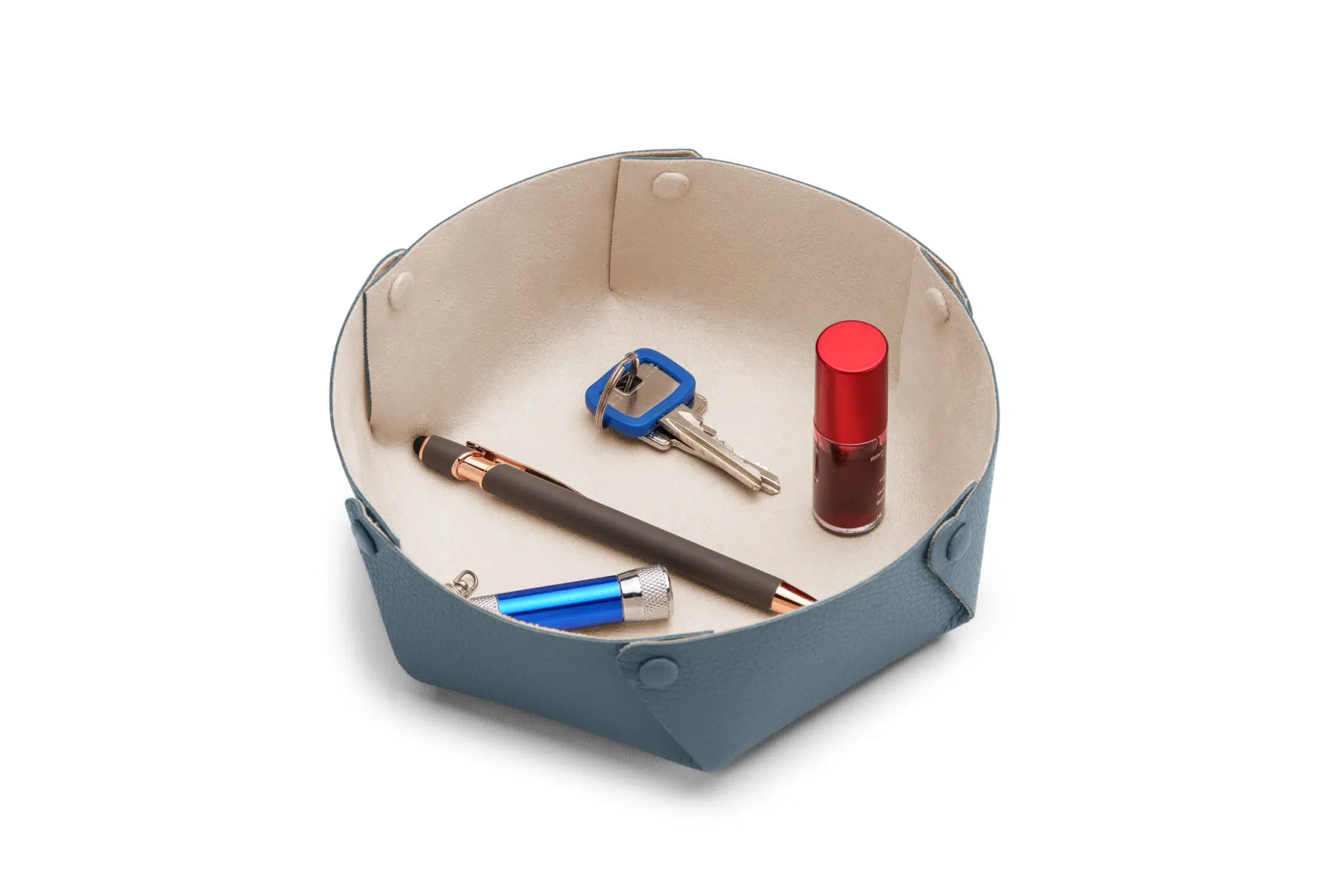 Der größte unserer drei runden Taschen-Entleerer bewahrt deine Schätze oder kleine Handtücher sortiert auf oder dient als Bonbonschale. Die schöne Form ermöglichen sechs farbig angepasste Druckknöpfe. Innen schützt eine weiche Textilfaser empfindliche Gegenstände und ist dabei außerdem widerstandsfähig. Als Reise-Tablett, Taschen-Entleerer oder Aufbewahrungsschale vielseitig einsetzbar.