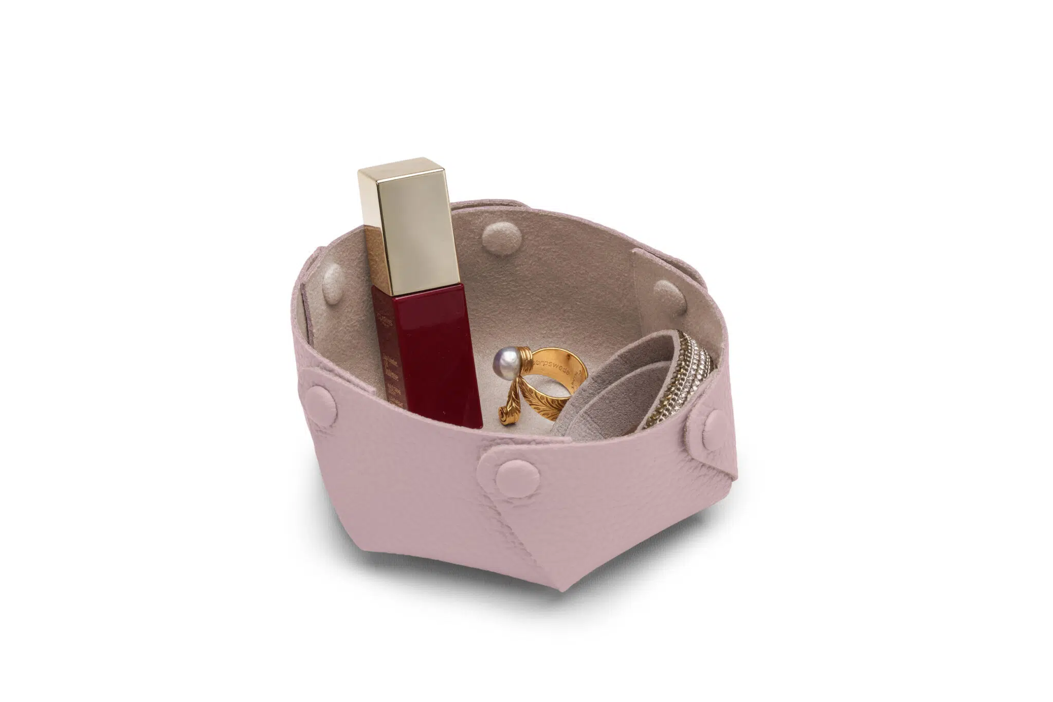 Klein, rund und mit mehr Höhe präsentiert sich unser neuer Taschenentleerer. Die schöne Form ermöglichen sechs farbig angepasste Druckknöpfe. Innen schützt eine weiche Textilfaser empfindliche Gegenstände und ist dabei außerdem widerstandsfähig. Als Reise-Tablett, Taschenentleerer oder Aufbewahrungsschale vielseitig einsetzbar.