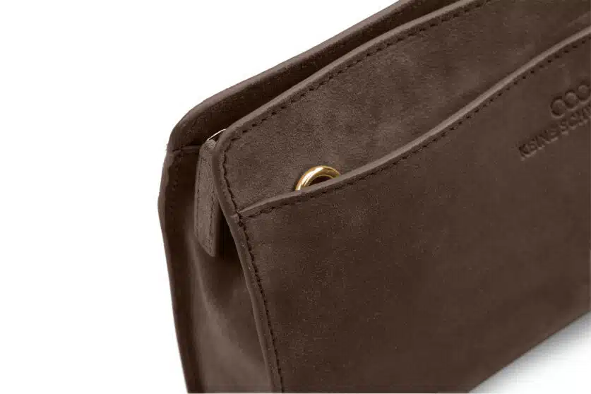 - zwei flache Außenfächer mit versteckten Anschlussösen zur Befestigung des Gurtes und mit Magnetdruckknöpfen,