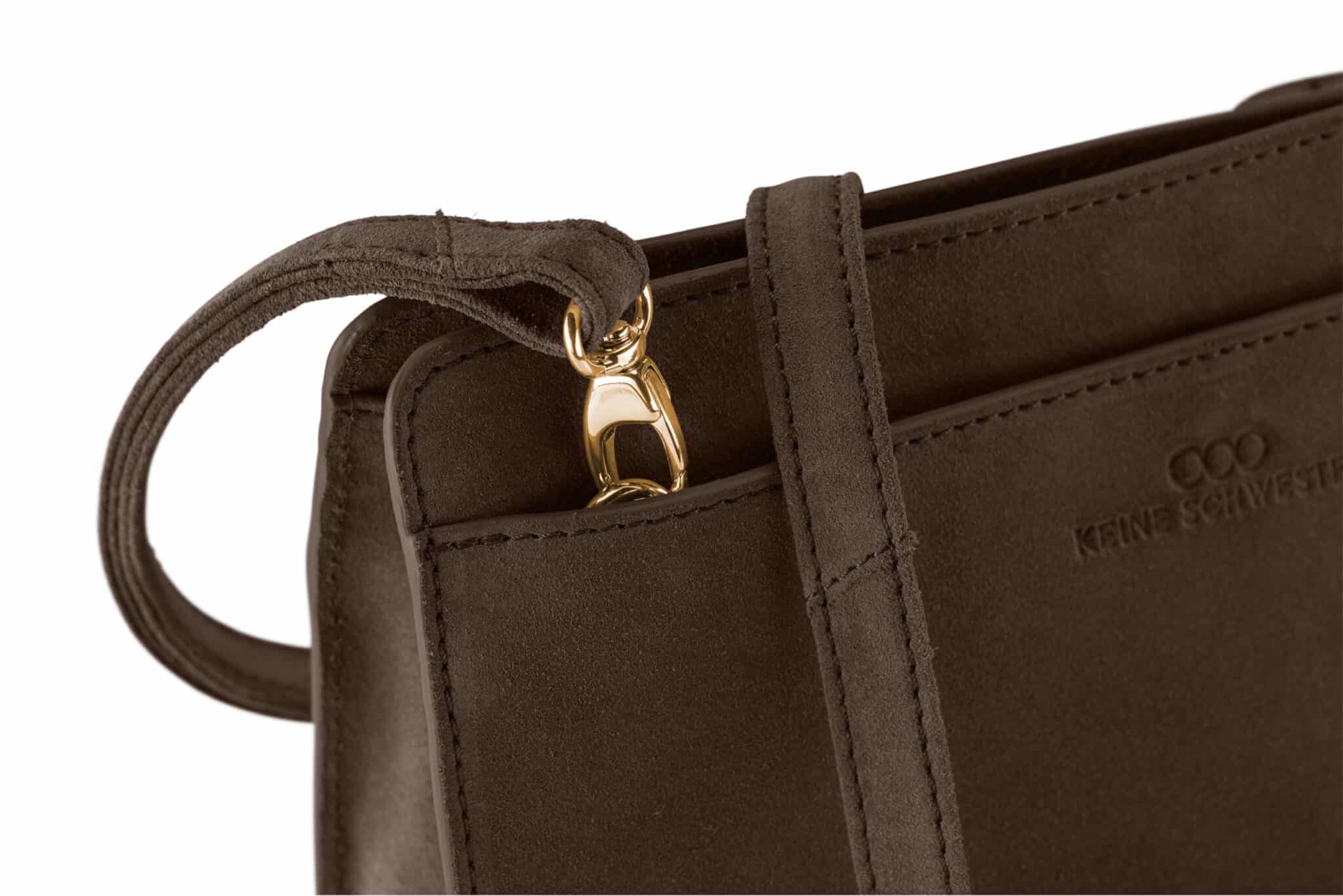 - zwei flache Außenfächer mit versteckten Anschlussösen zur Befestigung des Gurtes und mit Magnetdruckknöpfen,