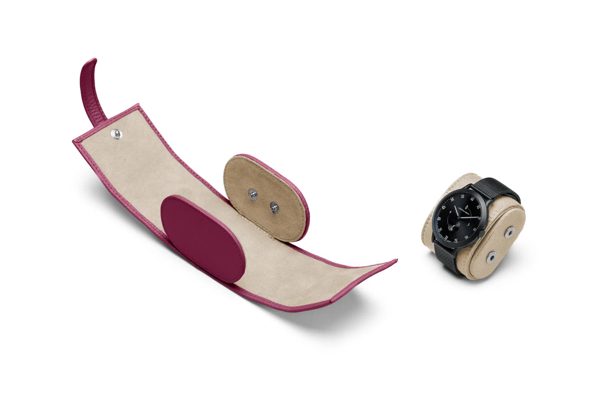 Für die Reise oder zur Aufbewahrung zuhause verstaut dieses handliche Etui deine Uhr schonend und sicher. Elegant verschlossen mit einem verdeckten Druckknöpf und einer Lasche überzeugt das pure und praktische Design. Innen ist die Box sind mit weichem Textil bezogen.