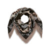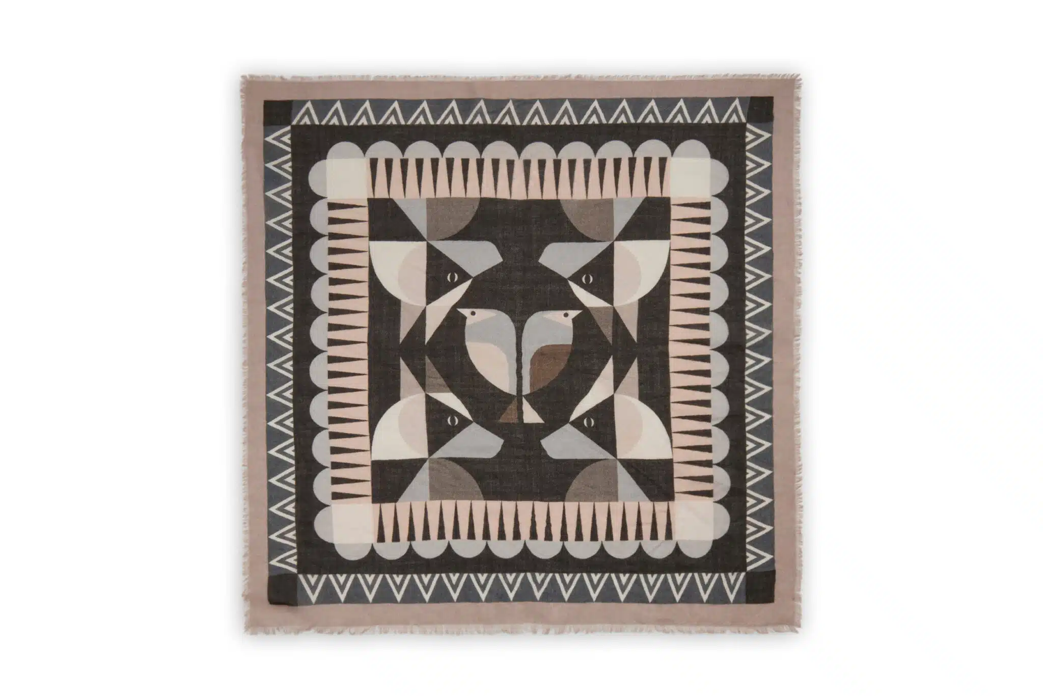 Dieses grafisch inszenierte Premium Tuch ist sehr trendy mit geometrischen Formen und abstrakten Motiven von Hundeköpfen und Vögeln gestaltet.